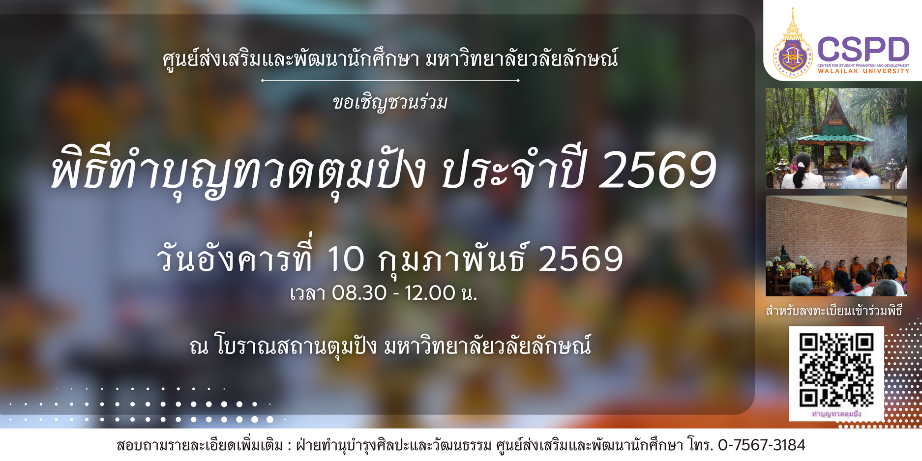 ศูนย์ส่งเสริมและพัฒนานักศึกษา ขอเชิญผู้บริหาร บุคลากร นักศึกษาเข้าร่วมกิจกรรมทำบุญทวดตุมปังและร่วมถวายภัตตาหารพระภิกษุสงฆ์ และตั้งโรงทาน ในพิธีทำบุญทวดตุมปัง ประจำปี พ.ศ.2569